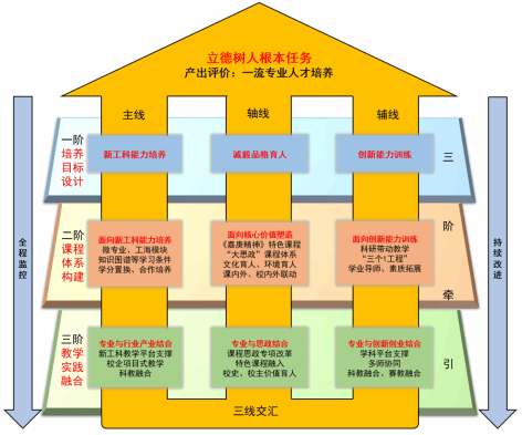 学校不断推动培养模式改革,强化从“培养目标设计”到“课程体系构建”到“教学实践融合”的OBE理念牵引;驱动各相关专业坚持“诚毅品格育人轴线”,融合“新工科能力培养主线”“创新能力训练辅线”,形成“三线交汇”的培养路径;构建“全程监控”“产出评价”“持续改进”三环相扣的质量保障体系。打造产出理念牵引、复合培养路径实施、质量体系保障的一流专业人才培养模式改革范式。