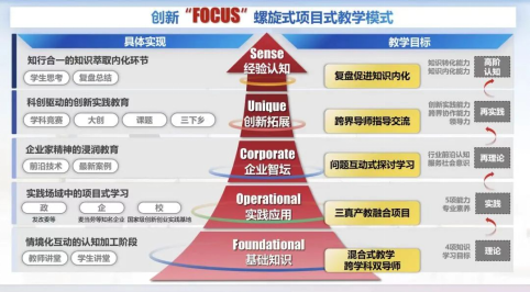 学院深入挖掘产学研用内涵与价值,将企业实际运营中的项目、案例深度融入教学体系,探索出产教融合FOCUS螺旋式项目式“三真”教学模式,即还原真实场景、对接真实需求、研究真实数据。在课程设计上,以企业真实问题为导向,让学生模拟企业战略决策全过程进行案例分析、战略制定与评估。