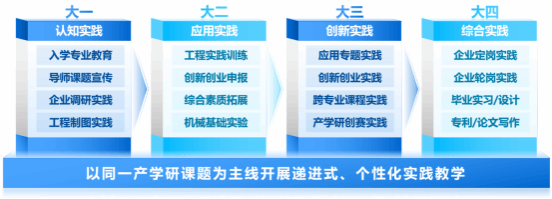 针对实践教学“碎片”化的问题,以同一个产学研课题为主线,构建递进式实践课程体系。入学时通过导师制组建学生实践团队,开展个性化专题实践:①大一假期到企业认知实践,了解企业需求;②大二以产学研课题组队申报大学生创新创业项目;③大三以同一产学研课题参加应用专题实践和科创比赛;④大四以同一产学研课题开展毕业实习、毕业设计等综合实践,运用专业知识解决机械复杂工程问题。注重“实践认知-基本实践能力-创新实践能力-综合实践能力”的递进式培养,各阶段实践内容保持延续与递进,形成一条完整的主线。