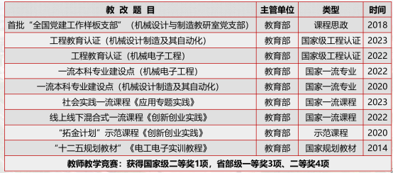 1.专业建设卓有成效。机制专业和机电专业入选国家级一流本科专业建设点,机电专业和机制专业双双通过中国工程教育认证。机械类专业获批省高校服务产业特色专业、卓越工程师教育培养计划试点专业、综合改革试点专业。7门课程入选一流课程建设(国家级3门),1个实验基地获批省级“人才培养模式创新实验区”。